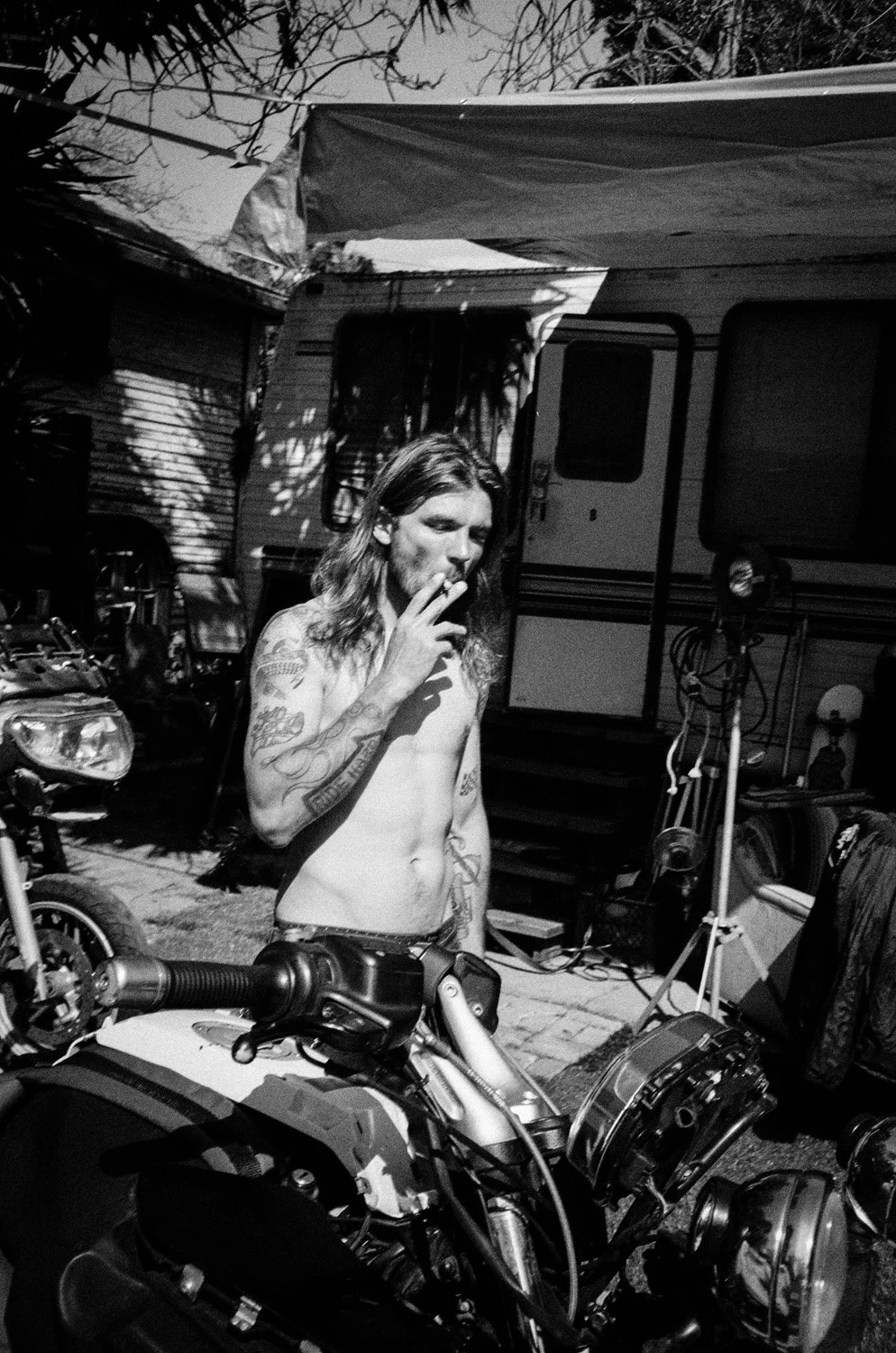 I met Gleb Cherniy at Cramps night. I couldn't really understand much of what he was saying because of the loud music, and plus, Russian accents are tricky when you're from the South. But I knew right away I wanted to take his picture. He invited me down to his compound where he lives and builds motorcycles. He's covered in wild tattoos, he builds all sorts of cool bikes, and if you ask nicely he might take you surfing.