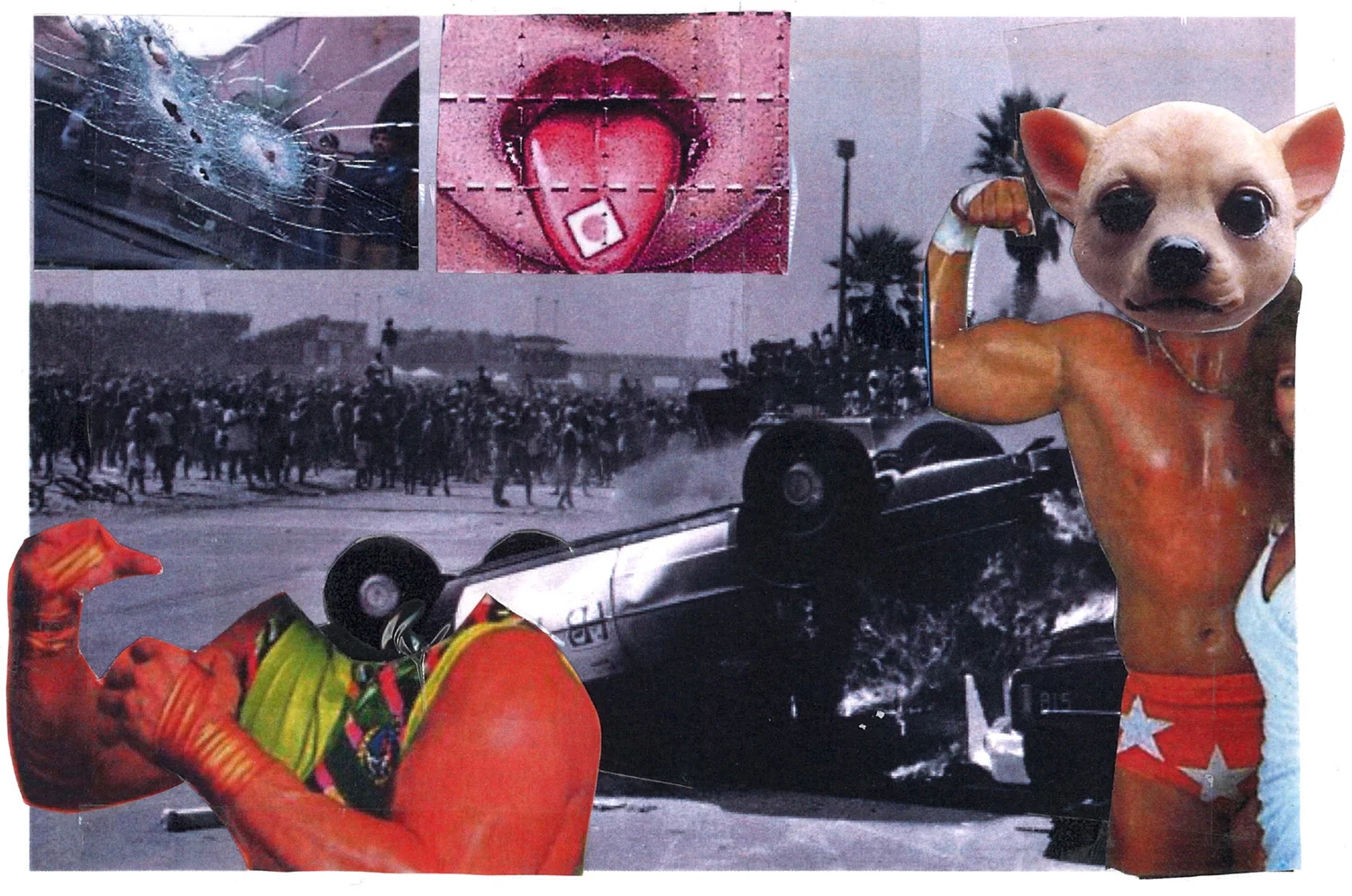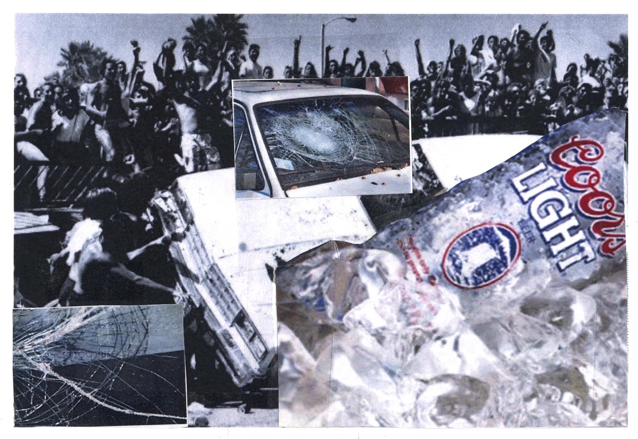 These days Zed is dead (never made it) and the OP Pro is now the Vans US Open. Thinking back, it’s amazing I had no idea that Huntington Beach was breaking down before me. I just figured it was bad acid or a psychotic episode. For a long time I wondered if somehow the Gravy-Hog was part of me? What did he represent? And is my spirit guide animal really a sopping wet dog? My answer didn’t come until about two years ago while skimming through a zine. I was immediately drawn to a photo of the beach, a dark black cloud of smoke choking the horizon. And the blimp! A beautiful Good Year blimp serenely floating above the chaos. And flanking the sea of ant like rioters is an orange sinewy beach goer, naked from the waist up. It gave me total déjà vu. It wasn’t him, but this guy could be the Gravy-Hog’s little brother. Or, on second thought–– maybe we’re all Gravy-Hogs in this melting world?